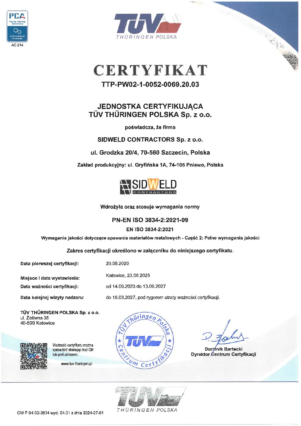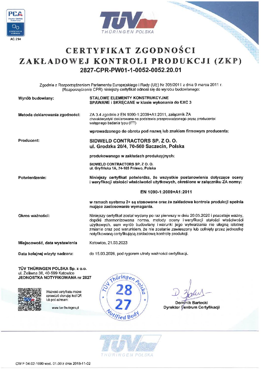 SidWeld Contractors Sp. z o.o. posiadamy certyfikaty z zakresu montażu i spawania konstrukcji stalowych, zgodne z systemem zarządzania BHP. Nasze kwalifikacje są zgodne ze standardem SCC, a także obejmują spawanie stalowych elementów nośnych budowlanych na wszystkich etapach budowy wg normy EN 1090-1:2009+A1:2011 oraz spawanie wg PN-EN ISO 3834-2:2007.
